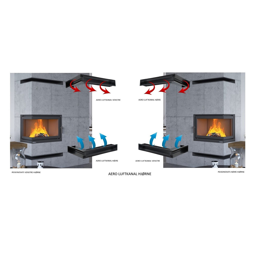- Ved en højrevendt indsats monteres AERO Venstre som luftindtag under pejsen og AERO Højre som varmeluftudslip ovenover.